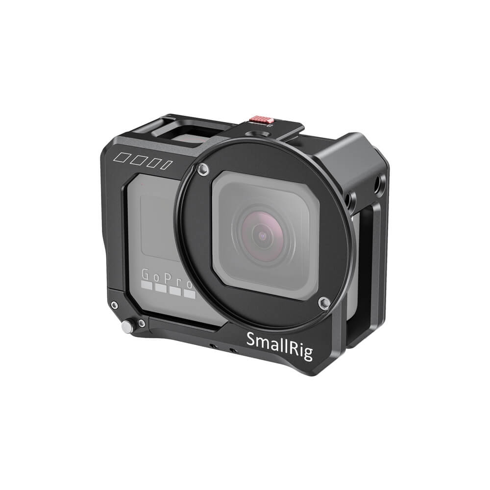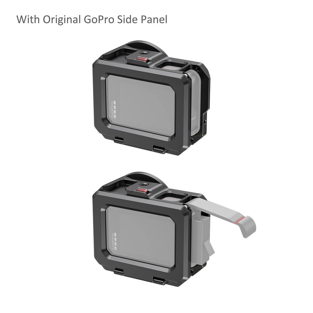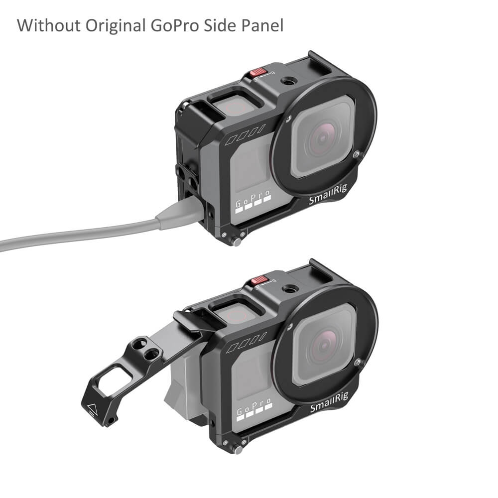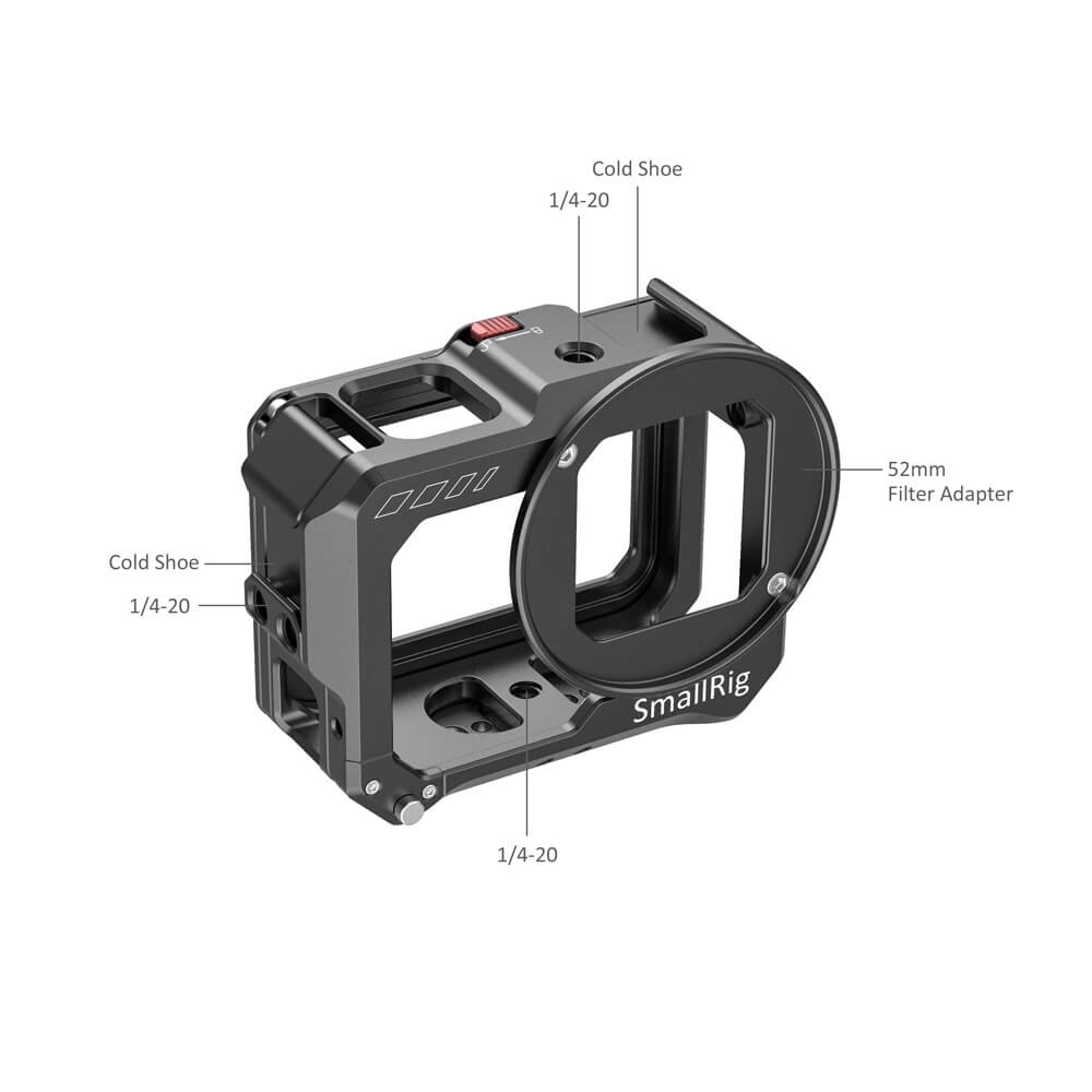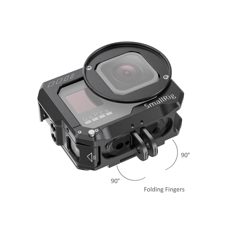 SmallRig Vlogging Cage for GoPro HERO8 Black CVG2505 is a lightweight aluminum cage that protects the camera while providing plenty of accessory mounts, without interfering with the camera’s button, port, and battery access. Slide the camera into the cage (take off the camera’s side battery door first), and simply press the cover to lock it in place. The cage features two cold shoes and several 1/4”-20 holes for accessory mounting, like a microphone, a small LED light, SmallRig Cold Shoe Mount 1593 or 1960. The folding fingers on the bottom let you attach the camera on a variety of GoPro mounts and surfaces; while the 1/4”-20 mount at the center makes it possible to attach the camera on a 1/4”-20 tripod. The side panel is quick release for battery switches, and you can charge the camera through the USB-C port without opening the panel. The front of the cage features a filter ring that accepts filters with a 52mm thread.