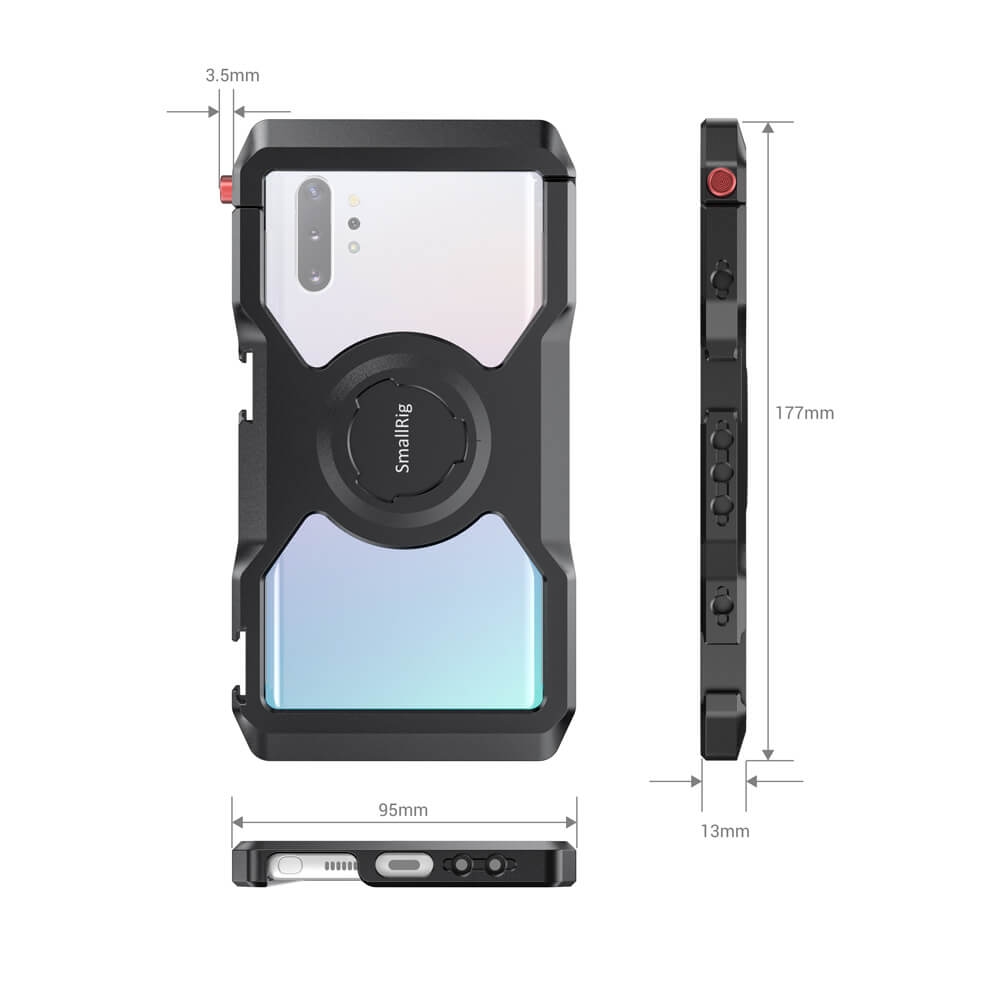 SmallRig Samsung NOTE10+CAGE Professional Edition CPS2454 is designed to protect your samsung note10+, and provide access to attach other accessories for mobile photo & video shooting, live streaming, interviewing, vlogging, etc.It comes with two cold shoes and multiple 1/4”-20 threaded holes, allowing mount of different accessories like a microphone, LED light, tripod, etc., and supports both horizontal vertical shooting. It’s compatible with SmallRig Aluminum Side Handle for Smartphone Cage HSS2424 for handheld shooting, and SmallRig Mobile Phone Cable Clamp BSC2390 to secure the cable during shooting. The inbuilt rubber shims help absorb shocks and prevent the phone from scratching. The hollowed out design that reduces weight and heats off the mobile phone avoids the interface and antenna area, thus avoiding the risk of signal interference. It also comes with a lanyard hole for a wrist strap.Quick opening and closing structure can be quickly opened and closed cage.