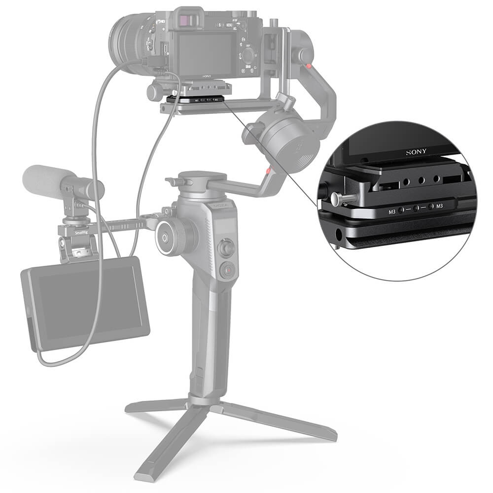 SmallRig Camera Riser Plate for Moza AirCross 2 2827 is designed to help balance the camera baseplate from horizontal direction on AirCross 2 gimbal, as well as increase the distance between the lens center and the pitch axis when vertical shooting. The plate secures to the middle of the L bracket and baseplate with an included long 1/4″-20 screw and locating pins to prevent twisting. Featuring three m3 threads in front which is compatible with SmallRig Focus Rod Mount 2828, the original single focus rod mount and lens support. It comes with rubber pad to prevent the baseplate from scratching. The original baseplate is able to adjust 64mm on horizontal direction after attaching the riser plate. Besides, when using a small, lightweight camera with a wide, heavy lens, you can also use this camera riser for additional support to increase the compatibility.