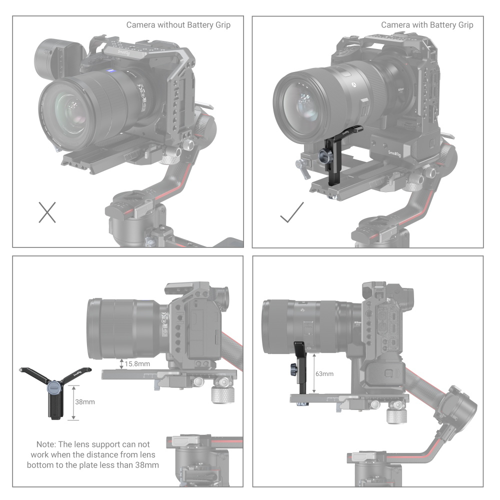 SmallRig Extended Lens Support for DJI RS 2 2850 is designed to support lenses that sit higher than the standard lens support can reach, like when the lens is mounted on a large camera body or a camera with battery grip. It is longer than the normal lens support and specially designed to work with Quick Release Plate 3031 to offer more height-adjustability. The support is vertically adjustable within 30mm, its screws can be tightened by hands. Together with quick release plate 3031, it can slide forward and backward within 30mm to adapt to lens of different length. Each side of the Y-shape mount features slot for lens strap to prevent shaking.