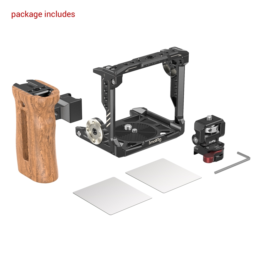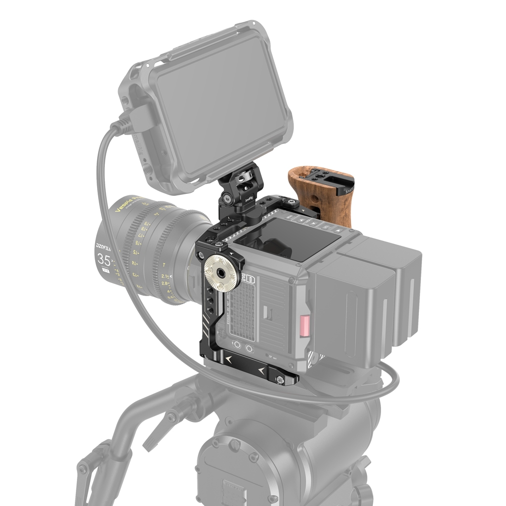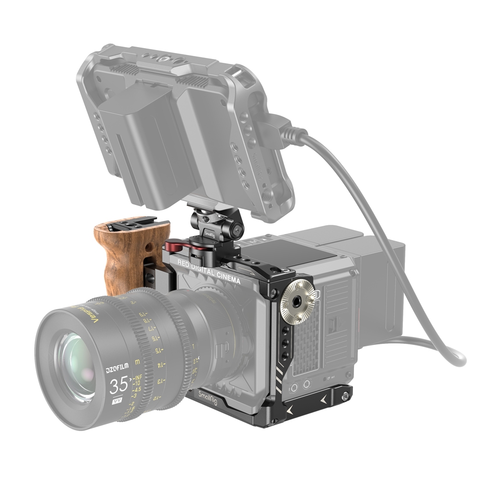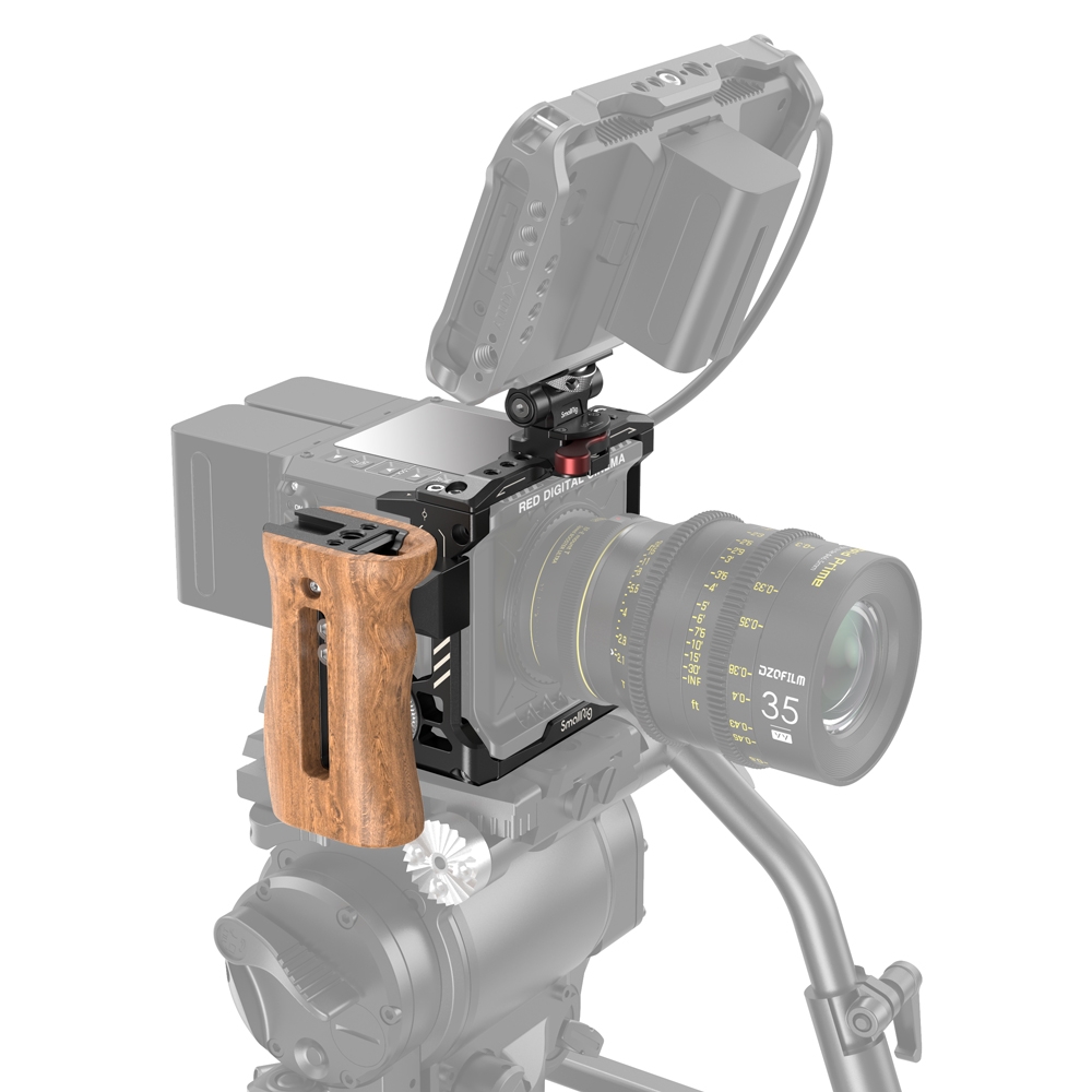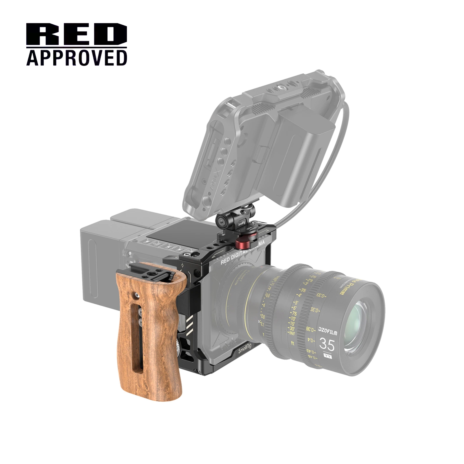 SmallRig Professional Kit for KOMODO 3209 includes a cage made of magnesium-aluminum alloy, light, and sturdy, which comes with 1/4”-20 threaded holes and an ARRI rosette mount that supports other accessories while its side NATO rails can fit NATO side handles. The wooden NATO side handle is ergonomically designed for a better grip experience and can be conveniently released with a NATO clamp for more efficient shooting. Its NATO monitor mount enables quick assembly and disassembly of monitors; two tempered glass screen protectors are easily pasted via electrostatic adsorption to protect the camera screen.