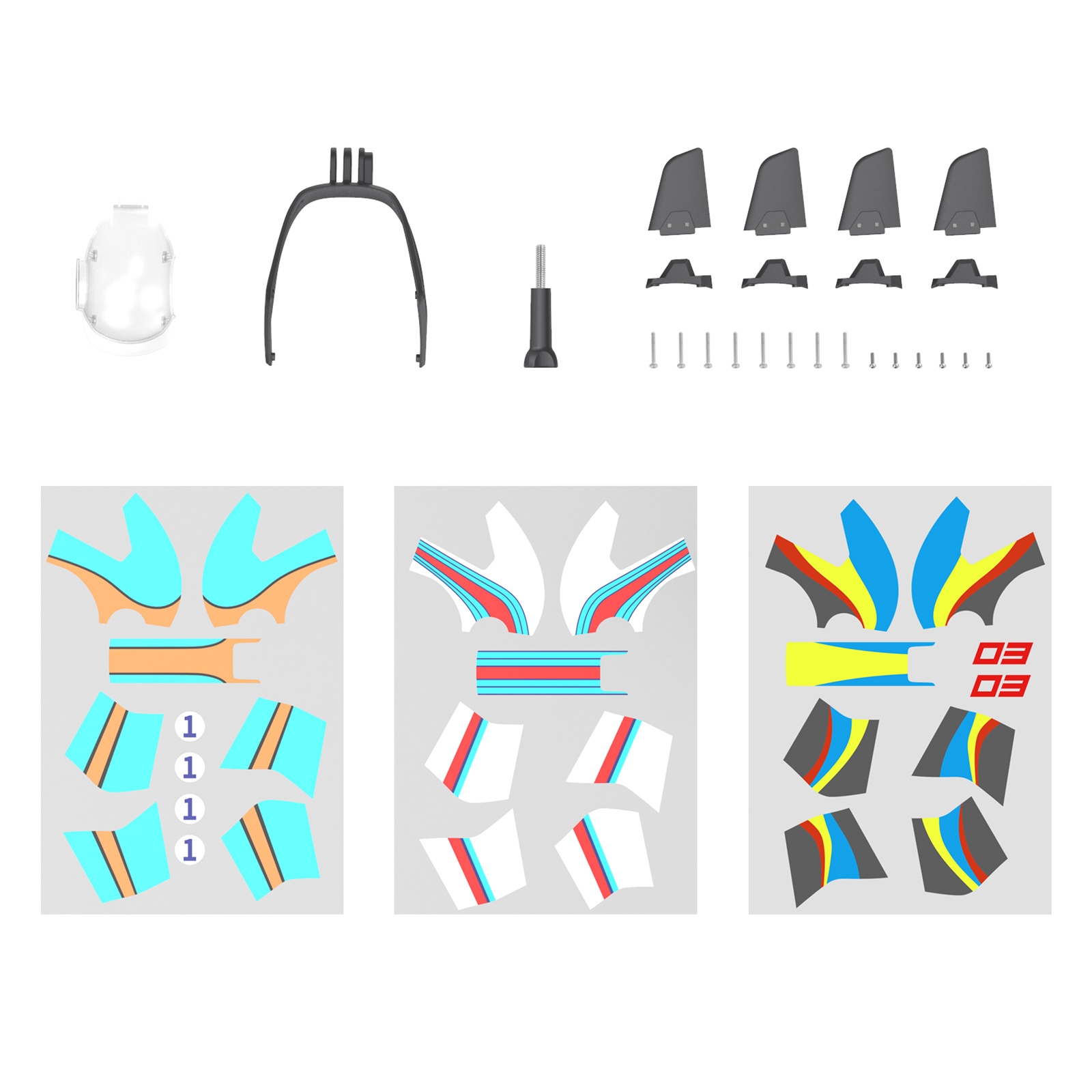 SmallRig DJI FPV Aerodynamics Accessory Kit 3281 packages a transparent gimbal head protector, a multifunctional mounting bracket, two pairs of vertical tails, and 3 colorful customized stickers. The transparent gimbal head protector can reduce airstream interference on the gimbal head during flight, ensuring smooth and stable video footage. It is precisely molded all-in-one high-quality optical material with a light transmittance of over 90%. Aerodynamic curve modeling, optimizing the airflow on the airplane nose and reducing the drag coefficient. Reduced energy consumption and improved performance at high speeds. The multifunctional mounting bracket adopts triangular support, which is integrated with the exterior of the fuselage. The multifunctional mounting bracket was instantly installed in FPV screw holes that support high centrifugal force and acceleration in fancy flight. Adapted to multiple action cameras and panoramic cameras in both aerial photography and racing scenes. Optimized in computer-assisted simulation tests, ensuring high heading stability and attitude hold during flight and ultimate performance in high-speed competitions. Vertical tails are Intactly installed in the original screw holes of the fuselage. Vertical tails use the quick-release design between the vertical tails baseplate and body. High-quality removable PVC stickers can be accurately cut in line with the camber of the fuselage that adapts to the arc of the fuselage, fit tightly, and tear off without traces. Professional outdoor ink print is waterproof and sun-proof with long-lasting colors. A gas vent is built in the rear that stickers can be fit without air bubbles.