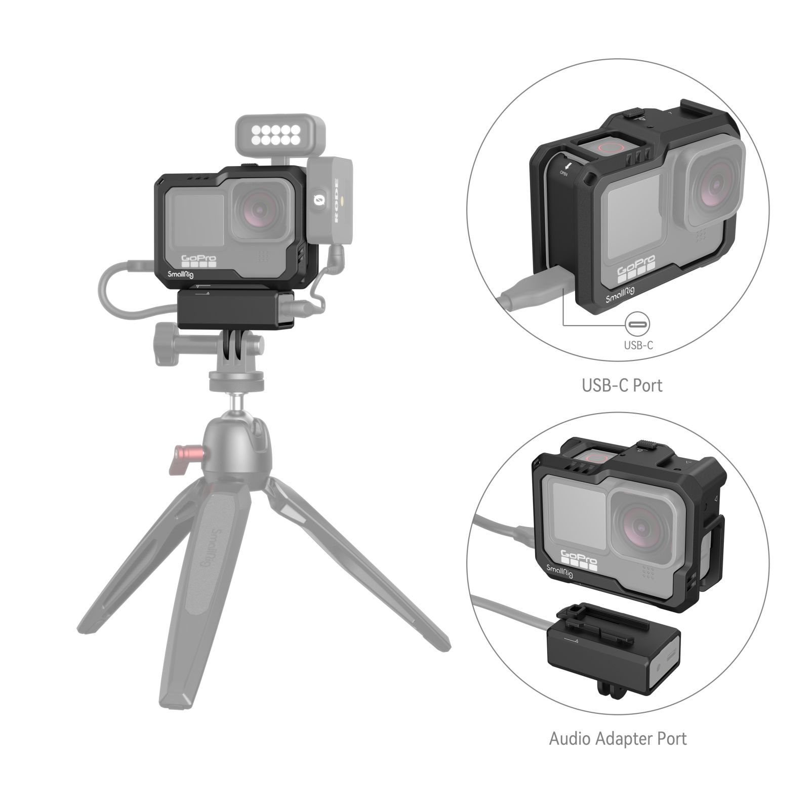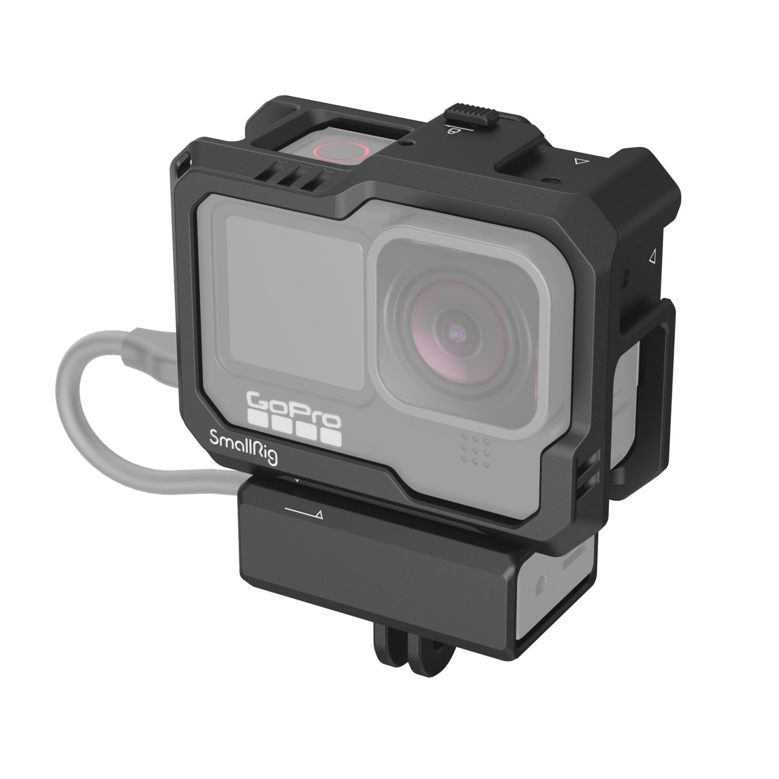 SmallRig Cage for GoPro 3083C comes with two cold shoe mounts, which are compatible with GoPro Light Mod and common microphone, and LED video light, providing a perfect Vlog filming solution. Its bottom mount supports the original GoPro 7 / 8 microphone adapter. It’s also compatible with other accessories released with the GoPro Hero13, including the GoPro ND Filter Kit for HERO 13 Black, GoPro Ultra Wide Lens Mod for HERO 13 Black GoPro Macro Lens Mod for HERO 13 Black, and GoPro Contacto Power Door for HERO Action Cameras. The attached side plate is interchangeable with the original one to allow audio recording while charging. The cage fits the camera so well that it does not block the screen, buttons, and USB-C port. It can be quickly locked by pressing the cover and released by pushing the button, only by hand. The bottom also features a dedicated foldable GoPro mount for the original GoPro baseplate or other accessories.