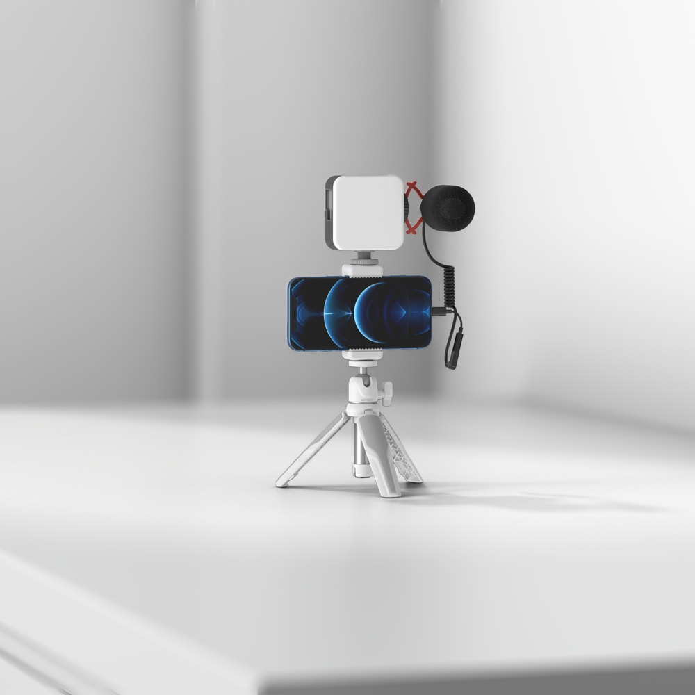 simorr Vigor VK-50 White Vlog Kit 3752. The kit consists of a portable vlog tripod, standard phone clip, Wave S1 lite microphone, Vibe P96 light, dual-cold-shoe extension bar, and a storage case, compact and designed for street shooting. Tripod and mobile phone clip using 1/4 screw connection, mobile phone clip, and the LED light bring a number of cold shoe mounts, can freely expand more equipment. Tripod size 16cm, safe load 1.5kg.