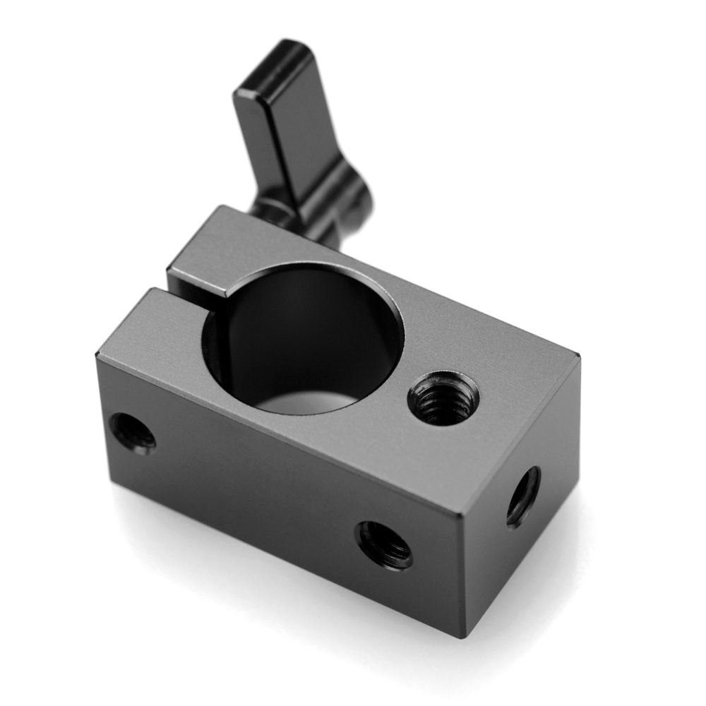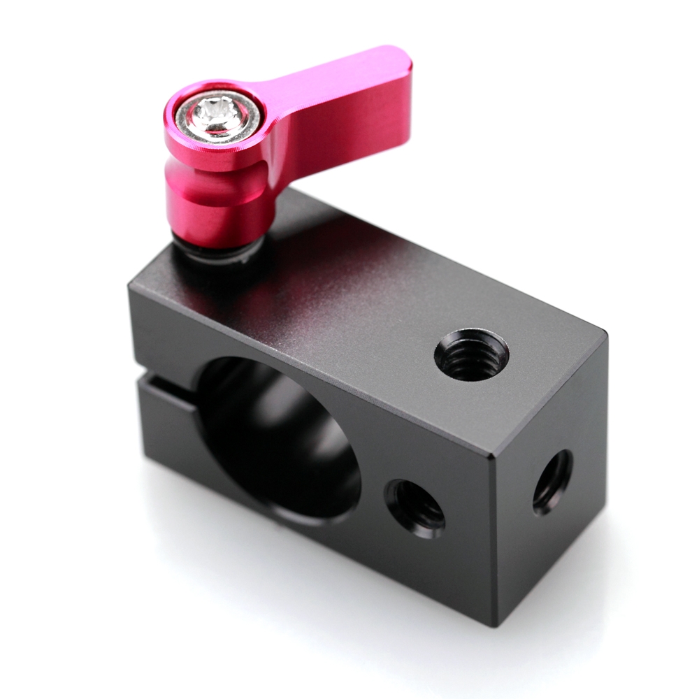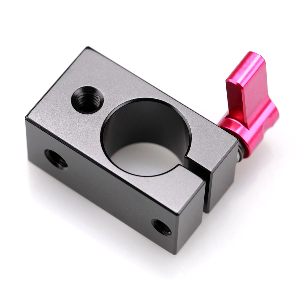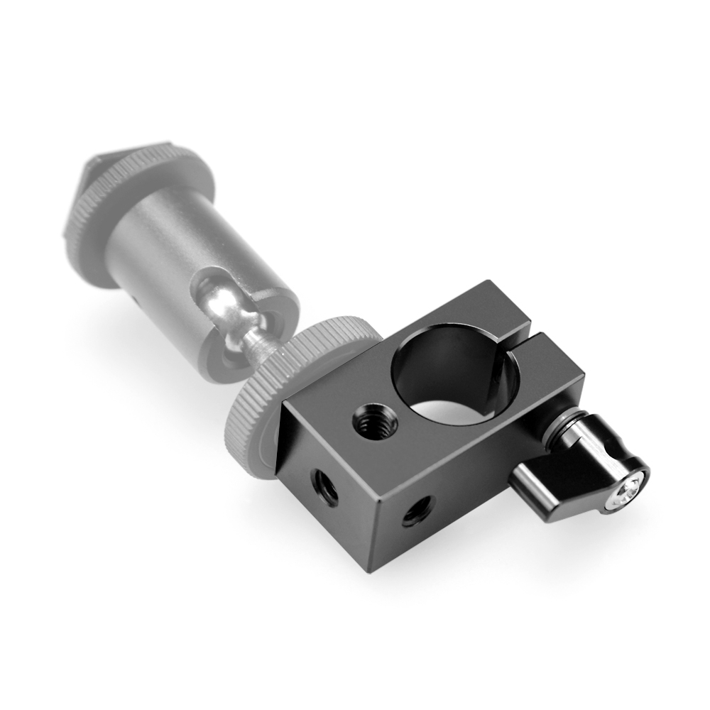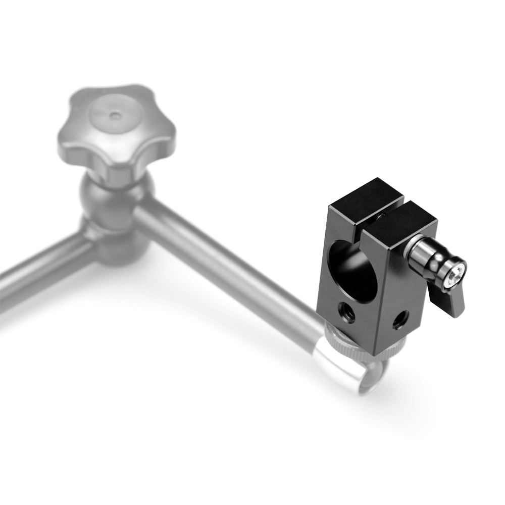 New version Single rod clamp 19mm w/ Four 1/4″ thread.You can install an Articulating Arm on the female 1/4″ thread, and install a monitor or a LED on the articulating arm.
