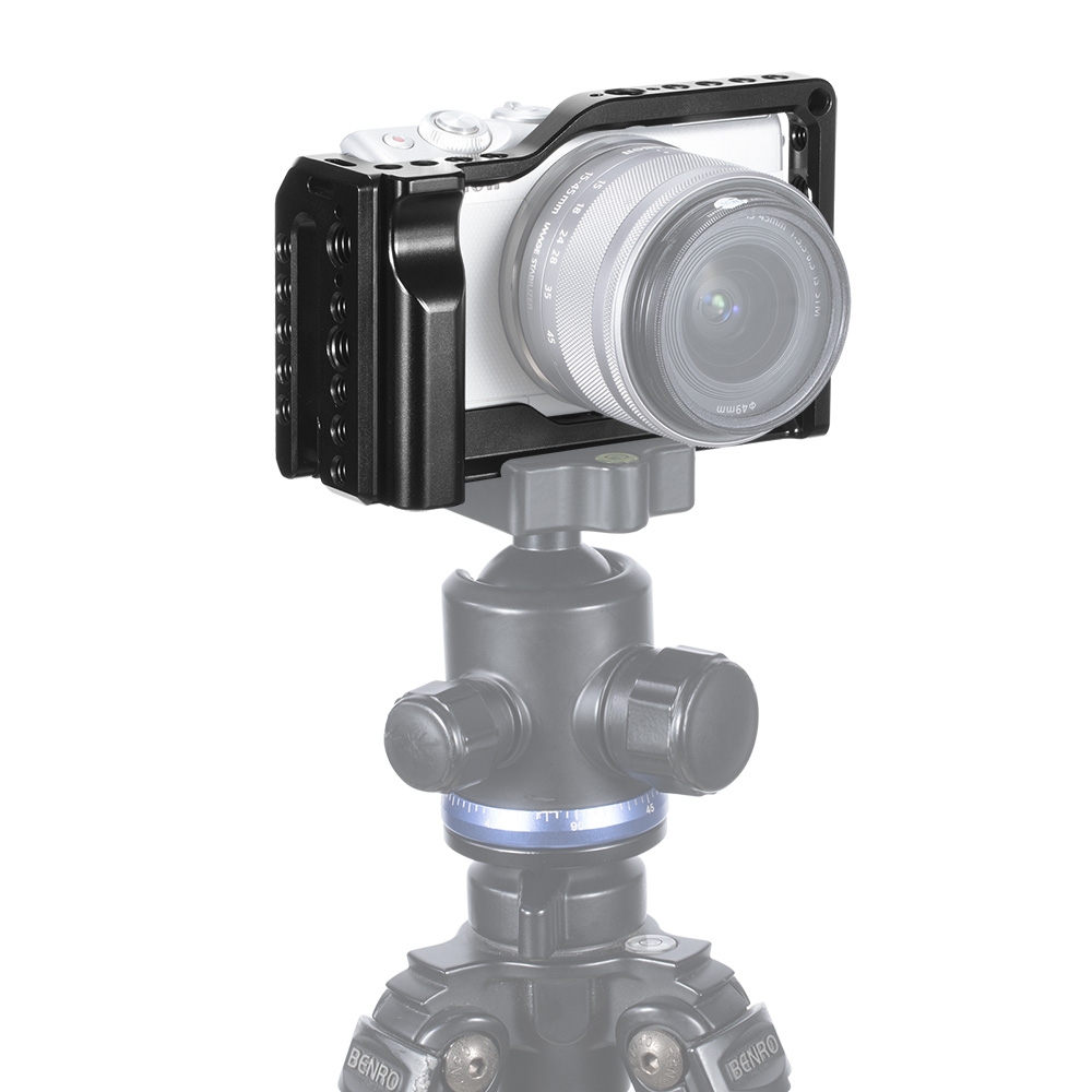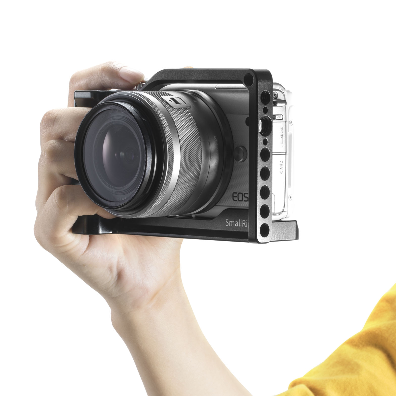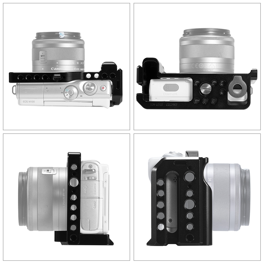 SmallRig Cage for Canon EOS M100 CCC2382 is a form-fitting full cage. It mounts to the camera’s tripod socket with a 1/4’’-20 screw, with anti-twist design and rubber cushion preventing wiggles. A larger grip moulded into the cage makes it more comfortable to hold the camera. It comes with multiple 1/4’’-20, 3/8’’-16 threaded holes and ARRI locating holes allowing mount of accessories. On the right side of the cage is a built-in NATO rail. Attach SmallRig Cable Clamp 1822 to protect the HDMI cable and port. The cage features a built-in Arca Swiss QR plate on the bottom which is super convenient to mount on Arca-compatible tripods or baseplates. It features a flat screwdriver on the bottom for quick installation. The cage ensures full access to buttons, ports, battery and flash of the camera.