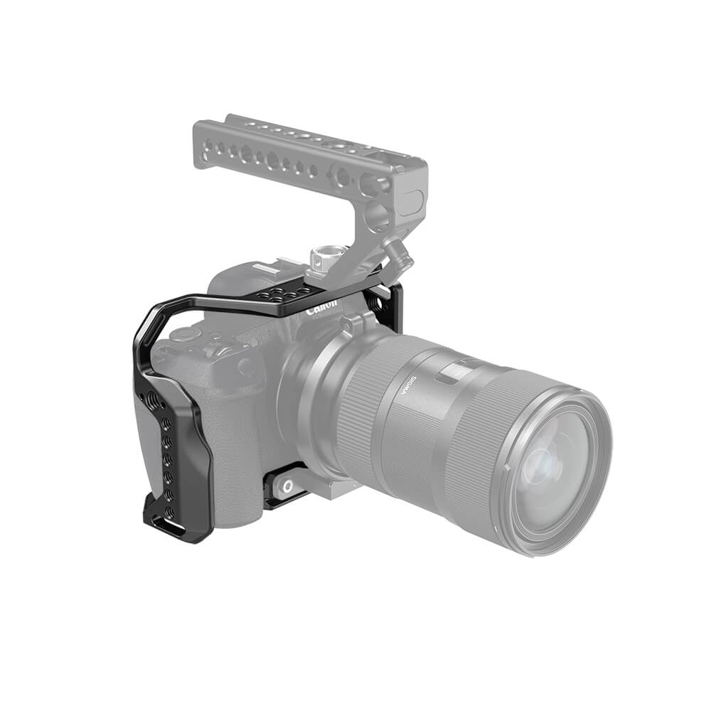 SmallRig Cage for Canon EOS R CCC2803 is a formfitting full cage designed to provide protection and accessory mounts for your camera. The cage secures to the bottom of the camera via a 1/4”-20 screw and features two pins for anti-twisting. It comes with multiple 1/4”-20 and 3/8”-16 threaded holes, ARRI accessory threads, and a cold shoe, allowing mount of accessories. For example, you can mount SmallRig Top Handle 2165 or SmallRig Wooden Side Handle 2093 for hand-held shooting; mount SmallRig Ball Head Magic Arm 2070 or SmallRig Monitor Holder 1842 to attach a monitor. It works with SmallRig Cable Clamp 1822 to protect the HDMI cable and port. If you use the Canon EF-EOS R lens mount adapter, you can use SmallRig BSA2696 to support the mount and relief pressure from the heavy lens. Additionally, The cage features a built-in Arca Swiss QR plate and a flat screwdriver on the bottom.