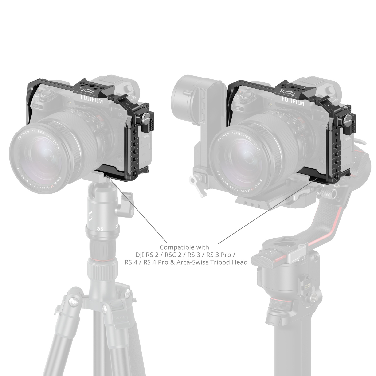 Furthermore, there is a built-in Arca-Swiss quick-release plate for direct mounting on Arca-type tripods and DJI RS 2 / RSC 2 / RS 3 / RS 3 Pro / RS 4 / RS 4 Pro stabilizers, enabling quick transitions between stabilizer, handheld, and tripod setups.