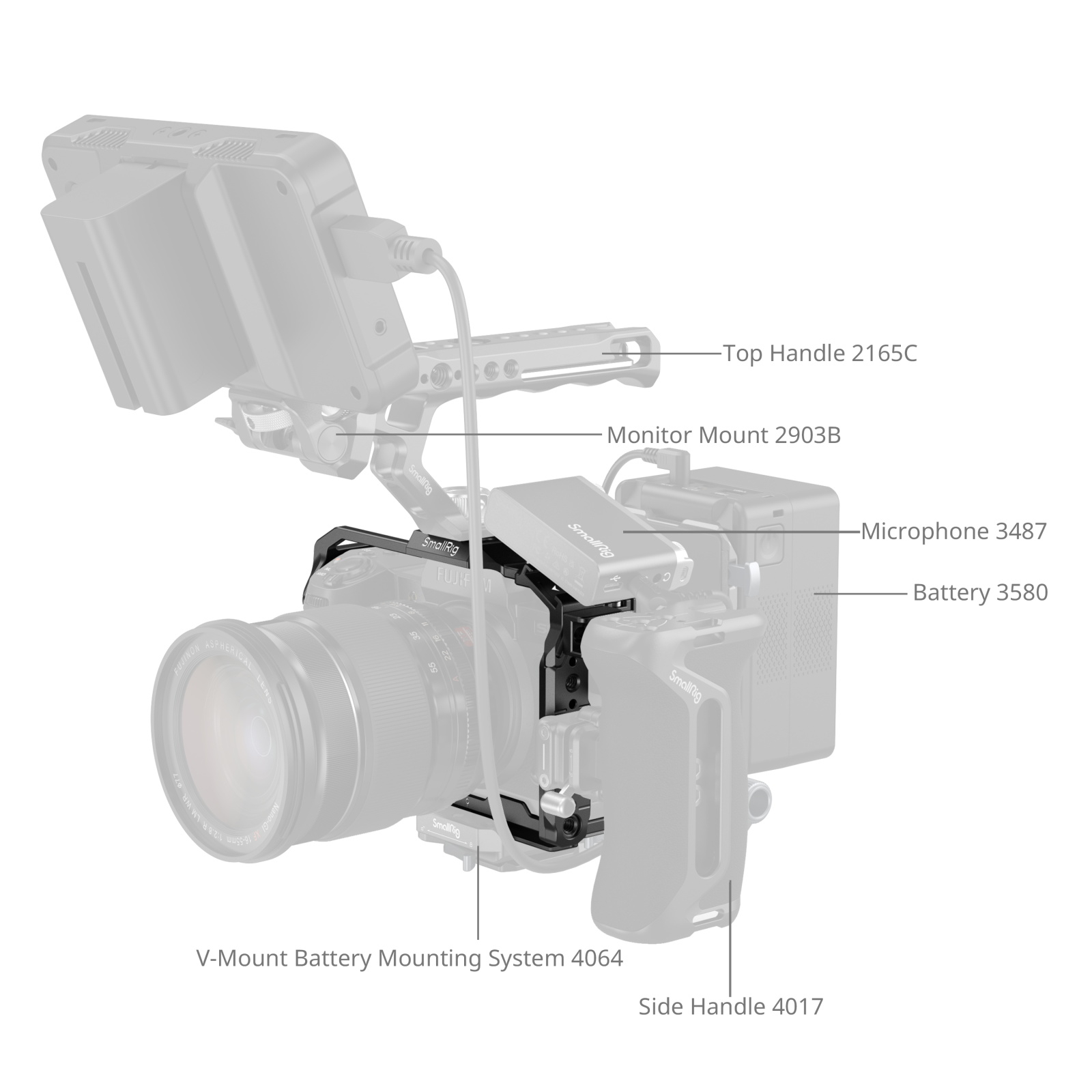 The cage features multiple 1/4″-20 threaded holes and ARRI locating holes for attaching various accessories, such as side handles (ID 2093, 4015, and 2913), top handles (ID 3765, 4483), magic arms (ID 3959, 3873), monitor mounts (ID 2903B, 4487), Manfrotto baseplates (ID 4638, 3158B), and more. Additionally, it includes a built-in cold shoe mount for attaching accessories like microphones (ID 3468) and LED video lights (ID 4660). The cage also features a built-in NATO rail for attaching accessories like side handles (ID 4485, 3260, 3813), as well as magic arms (ID 3875).