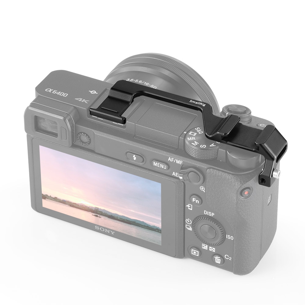 Designed for Sony A6300 and A6400, SmallRig Cold Shoe Relocation Plate BUC2317 provides the cold shoe mount for you to shoot vlog. It locks firmly via the hot shoe and the shoulder strap hole of camera. But it won’t scratch the original hot shoe of camera because of the rubber pad on the bottom. And it relocates the hot shoe of camera to the right side for allowing LCD touch screen of Sony A6400 tilting 180° up tilting when mounting microphone. Besides, it maintains the flashlight of camera access. Additionally, it is small and lightweight which adapts to being mounting to the camera all the time.