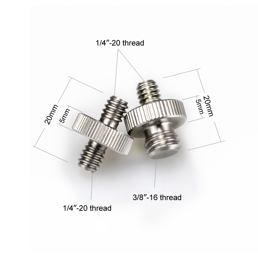 This is a combination of two double head screw: a 1/4″-20 to 1/4″-20 stainless steel (metal) screw, and a 1/4″-20 to 3/8″-16 stainless steel (metal) screw.