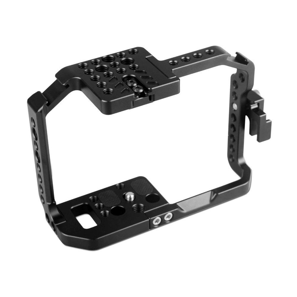 A formfitting cage that adds 1/4″-20 and 3/8″-16 mounting threads on all sides of the camera for easy attachment of a tripod plate, accessories, or creative camera rigging.