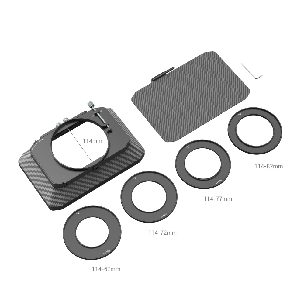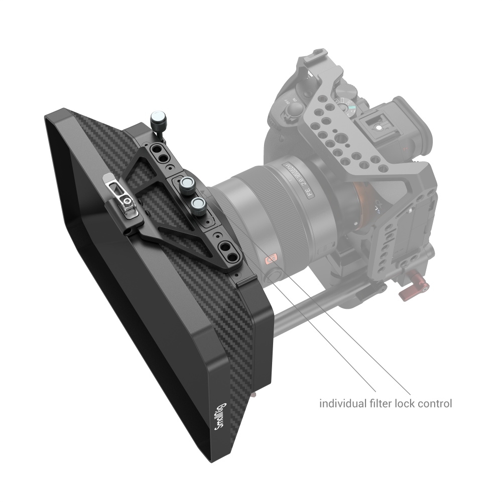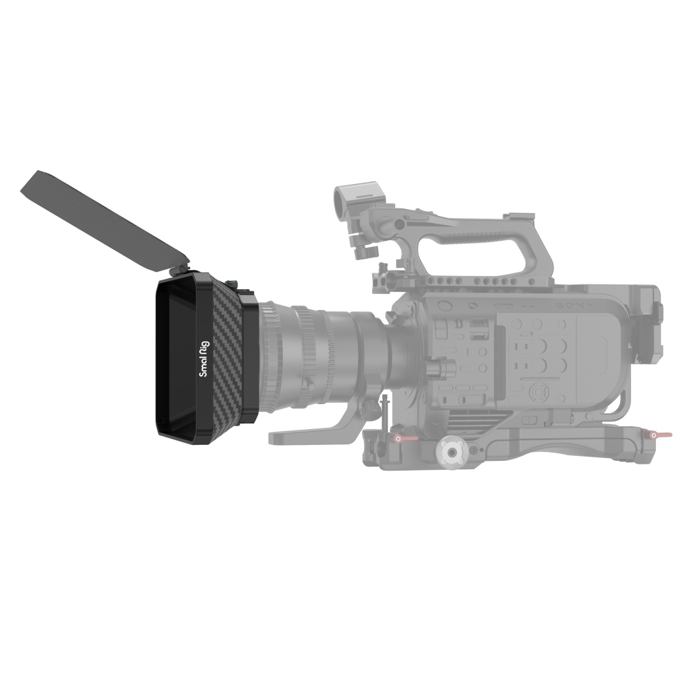 SmallRig Lightweight Matte Box 2660 is designed to block sunlight or other light to prevent glare and lens flare. It can be directly mounted onto φ114mm cine lens or other lenses via the attached φ67-114mm, φ72-114mm, φ77-114mm, φ82-114mm threaded adapter rings or optional φ95-114mm threaded adapter ring (ID: 3410). For φ67/φ72/φ77/φ82mm VND, ND, GND, CPL, UV and other special circular filters, threaded adapter ring (ID:3410) is recommended; for φ80/φ85/φ95/φ110 cine lenses, clamp-on ring kit (ID: 3408) is recommended. The matte box holds up to two 4mm thick, 4 x 4″ or 4 x 5.65″ filters at the same time, which are kept in place by independent thumbscrews and can be easily pushed out from the side without leaving fingerprints. Its carbon fiber top flag opens 0-180° to prevent glare. Optional 15mm dual rod clamp (ID:3411), together with 15mm LWS rods and φ114mm silicone donut (ID:3409) supports φ58-φ114mm lenses. Besides, the matte box features a lightweight and anti-reflective design to ensure picture quality and improve the shooting experience.