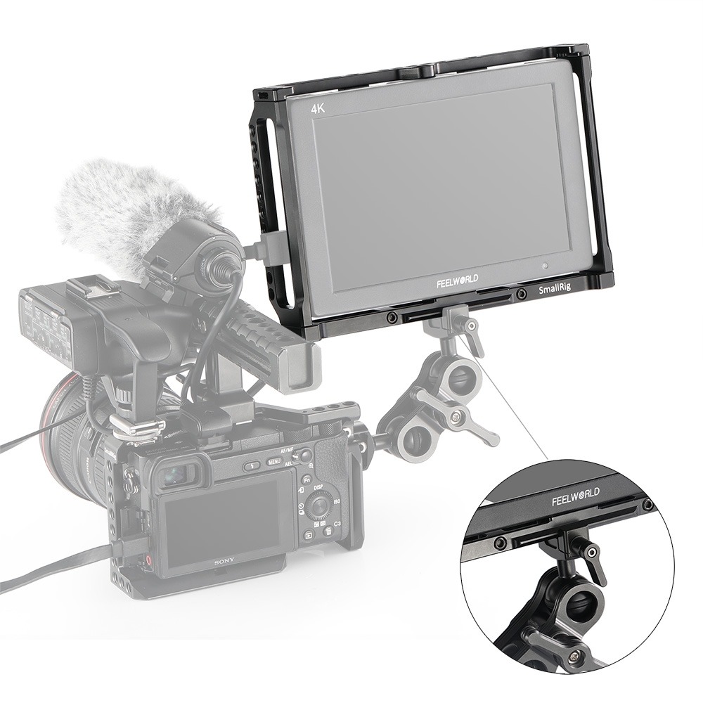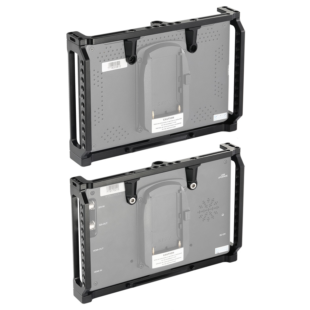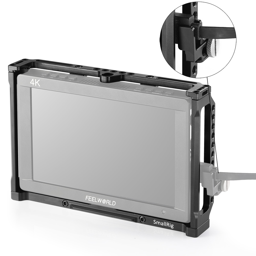 SmallRig Monitor Cage 2233 is specially designed for Feelworld T7, 703, 703S , MA7, MA7S and F7S Monitor to provide an all-around protection and mounting options. Monitor can be firmly fixed on the aluminum cage via multiple lock points on the top, bottom and back, which prevents twisting. The cage provides multiple 1/4″-20 holes on the top and bottom for attaching magic arm and EVF mount, such as 2070 and 2113. Besides, the monitor cage can attach side handles 2093 on both sides via 1/4″-20 holes for a comfortable handle support. It features a nato rail on the bottom for accessories with nato clamp to make your setup quick release, such as nato clamp 2205. Additionally, strap holes on the top are designed to attach neck strap for providing convenience to carry.