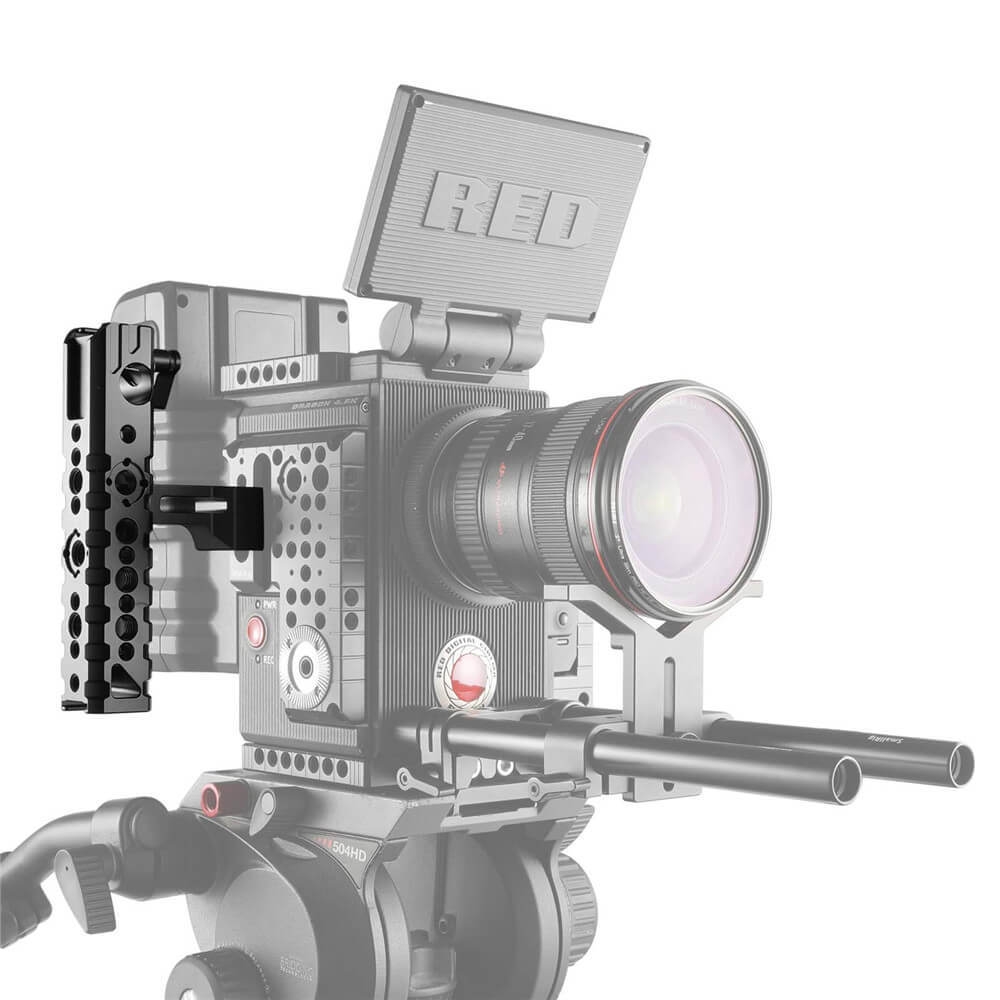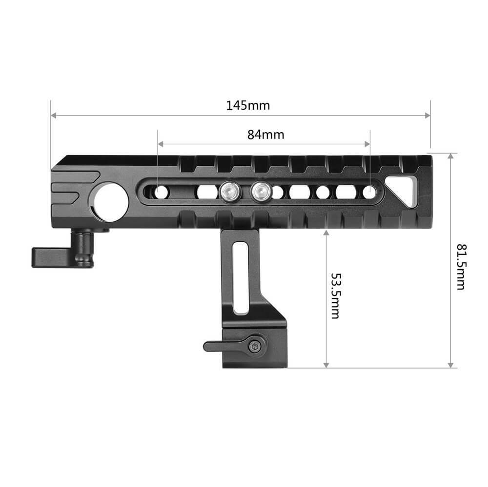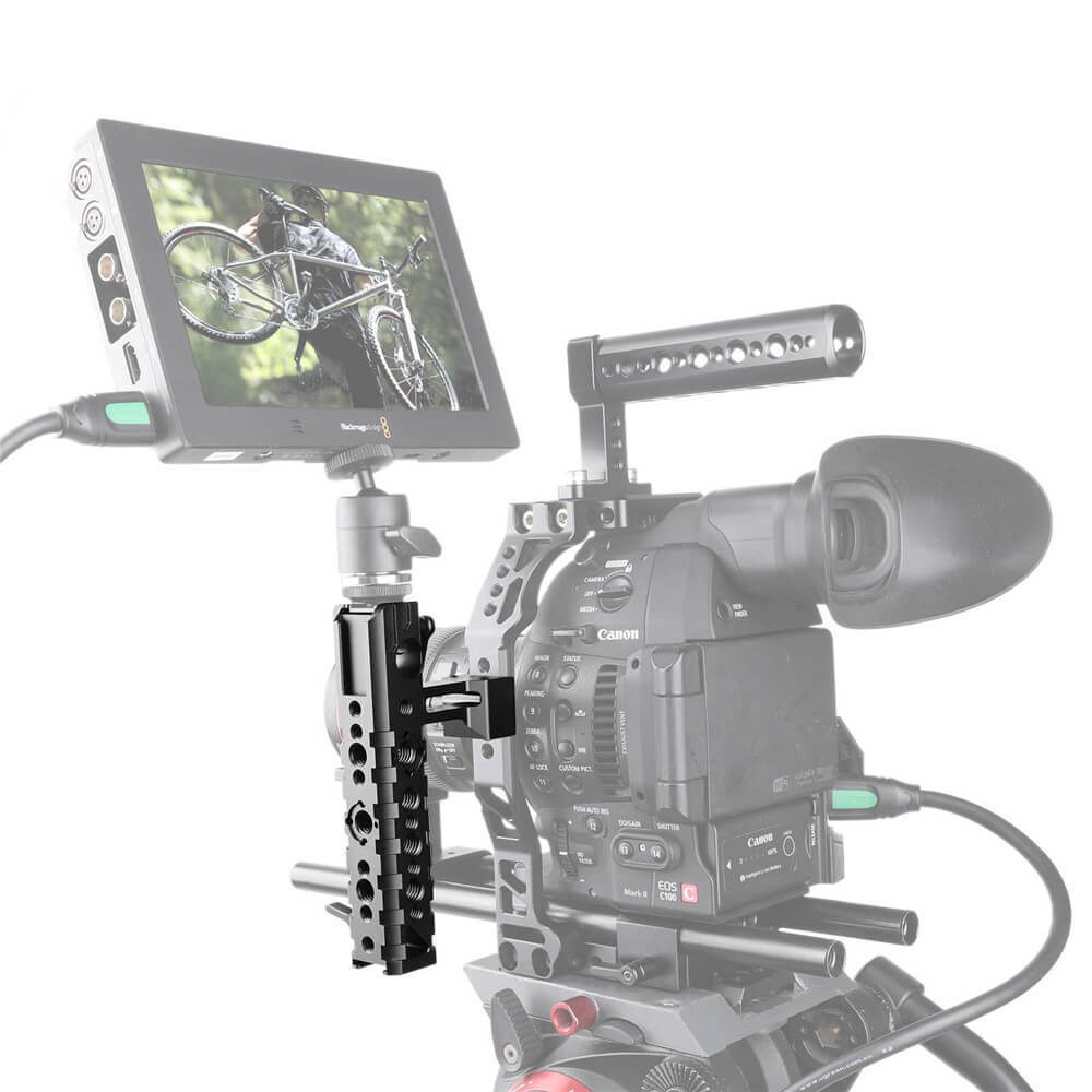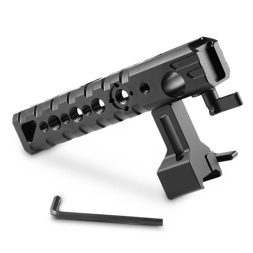SmallRig QR Cheese Handle 1688 is clamped onto a NATO-compatible rail and features 1/4″-20 and 3/8″-16 mounting holes for connecting accessories, as well as a single 15mm rod port. Moreover, the integrated shoe mounts at both ends are attached with shoe mount style accessories, such as LED lights, microphones etc.The handle comes with the hole pattern for ARRI accessory mount pins. Meanwhile, the exquisitely design with an array of mounting points makes the grip convenient.Except for sliding forwards and backwards on the NATO rail to keep your camera balance, the handle could be adjusted back and forth for the balance position of your rigs.This handle is ideal for low-mode shooting and your camera.