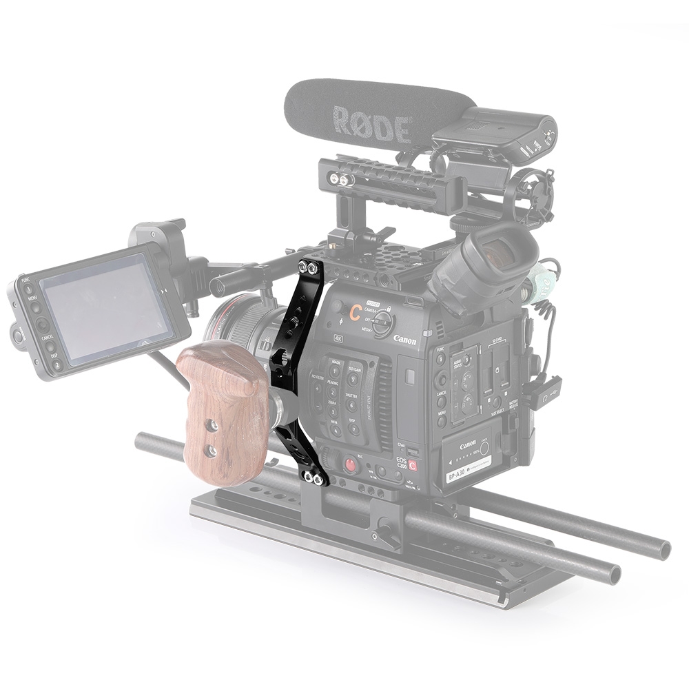 SmallRig Side Bracket for Canon C200 and C200B 2295 is designed to work with SmallRig Top Plate 2056 and Base Plate 2076. It does not block camera buttons on the left. In the middle of the bracket is a NATO rail which can directly attach NATO side handles like SmallRig Wooden Handle 2118 or SmallRig Handle 1688; attach SmallRig Ball Head Arm 2071 for a monitor; or attach SmallRig NATO to Rosette 2046 for a Rosette Arm. It comes with 1/4 and 3/8 threaded holes and ARRI locating holes so users can mount different accessories.