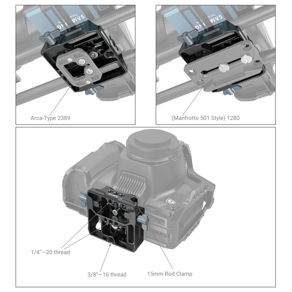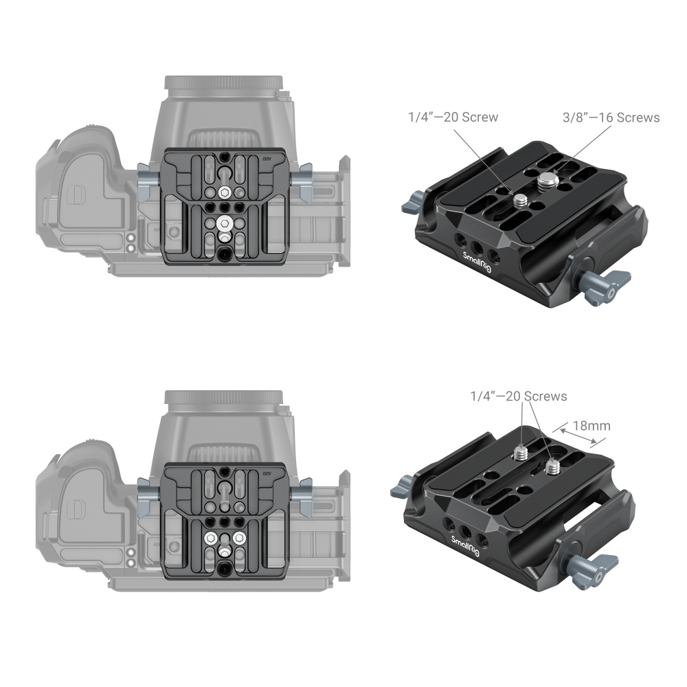 Lightweight and compact, SmallRig Universal LWS Baseplate with Dual 15mm Rod Clamp 3357 fits mainstream DSLR and mirrorless camera cages on the market. It works with dual 15mm rods to attach such accessories as lens support, follow focus, and matte box during handheld shooting and tripod shooting. It can ensure 85mm optical height when used with BMPCC 6K Pro Cage 3270. Its specially-designed bottom enables you to replace Samsung T5 SSD without removing the baseplate. Large built-in rubber pads prevent scratching and twisting. Multiple threaded holes at the bottom allow attachment of various sizes of quick release plates for tripod shooting.
